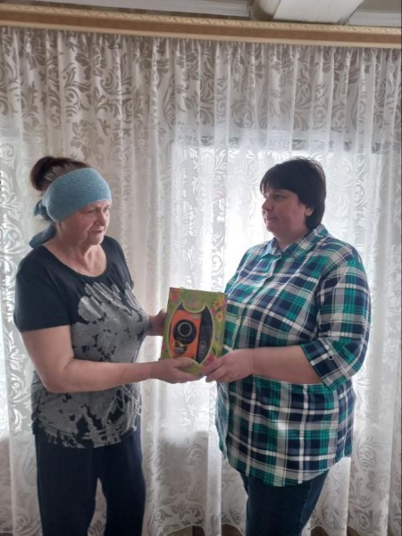 Социальный работник отделения социально-бытового обслуживания на дому №3 Лапшанская Н.Л. поздравляет обслуживаемую Абросимову В.Е. с наступающим праздником 8 Марта