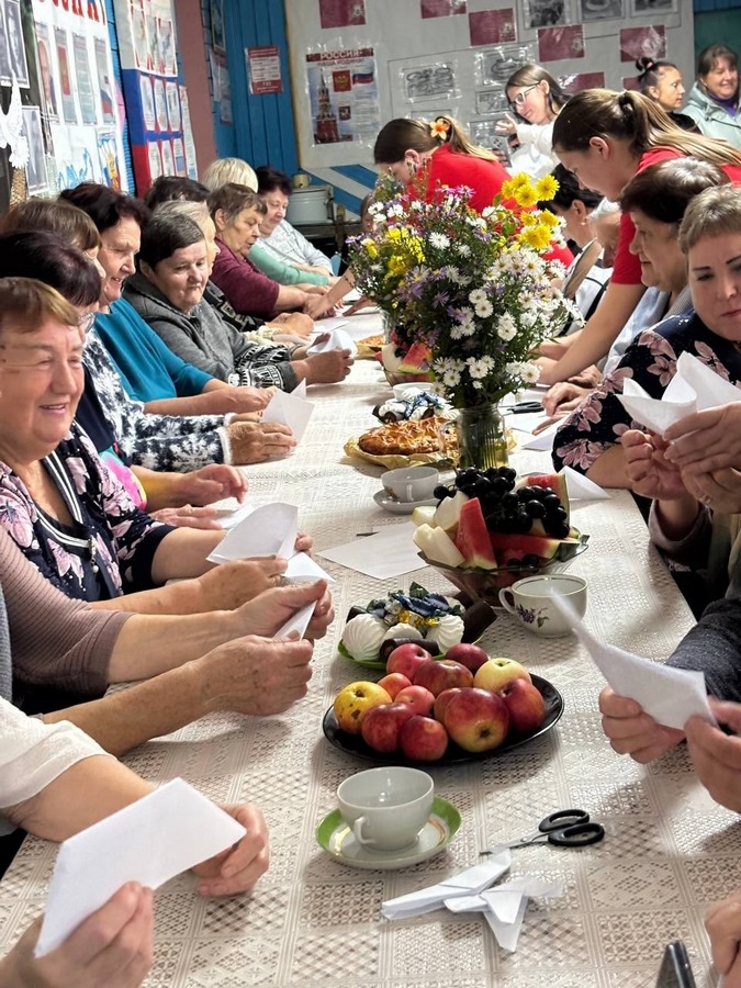 Мероприятие завершилось чаепитием за столом с ароматным чаем и вкусными пирогами, испечёнными руками самих участников и организаторов. За столом царила непринуждённая атмосфера общения: каждый делился воспоминаниями, мыслями и чувствами.